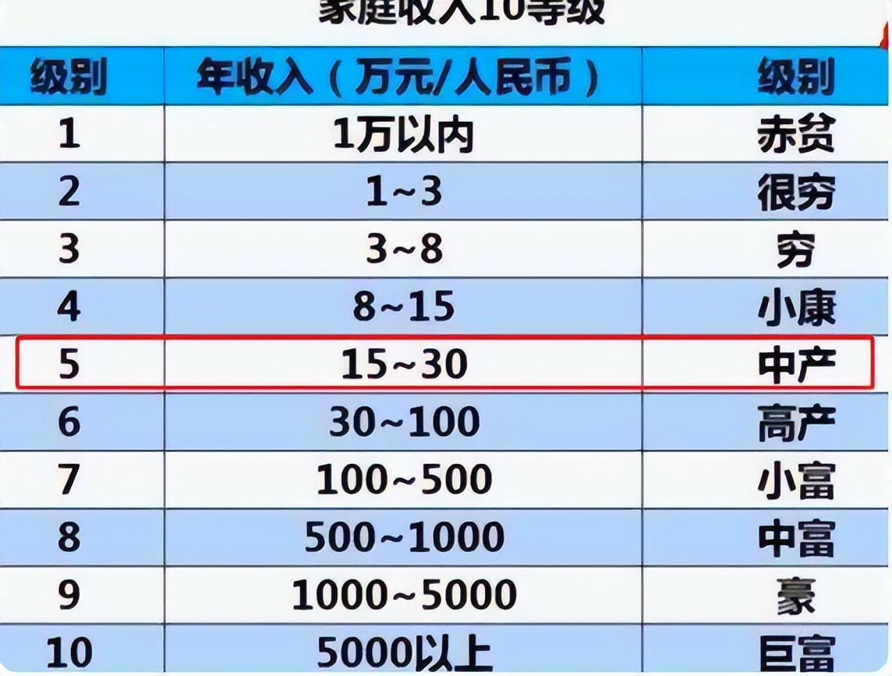 家庭收入4级的家庭年收入8~10万元,属于小康级别。家庭收入5级的家庭,年收入15~30万元,处于中产级别。家庭收入6级的家庭年收入30~100万,处于高产级别。