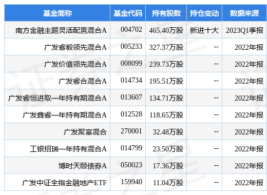 根据2023Q1季报公募基金重仓股数据,重仓该股的公募基金共1家,其中持有数量最多的公募基金为南方金融主题灵活配置混合A。南方金融主题灵活配置混合A目前规模为14.83亿元,最新净值1.471(5月4日),较上一交易日上涨0.14%,近一年上涨5.07%。该公募基金现任基金经理为黄春逢 金岚枫。黄春逢在任的基金产品包括:南方成份精选混合A,管理时间为2015年12月30日至今,期间收益率为31.84%;南方平衡配置混合,管理时间为2017年7月15日至今,期间收益率为47.75%;南方益和混合,管理时间为2019年1月25日至今,期间收益率为58.36%。