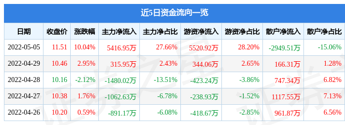 资金流向数据方面,5月5日主力资金净流入5416.95万元,游资资金净流入5520.92万元,散户资金净流出2949.51万元。