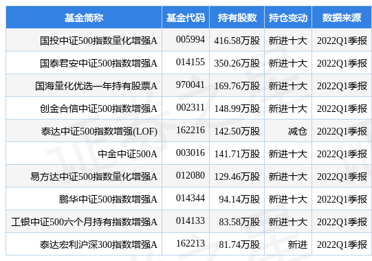 根据2022Q1季报基金重仓股数据,重仓该股的基金共15家,其中持有数量最多的基金为国投中证500指数量化增强A。国投中证500指数量化增强A目前规模为11.73亿元,最新净值1.9753(5月5日),较上一交易日上涨0.82%,近一年下跌2.62%。该基金现任基金经理为殷瑞飞。殷瑞飞在任的公募基金包括:国投瑞银金融地产ETF,管理时间为2013年10月26日至今,期间收益率为130.56%;国投瑞银中证资源指数,管理时间为2014年7月24日至今,期间收益率为128.4%;国投瑞银沪深300量化A,管理时间为2019年6月11日至今,期间收益率为34.09%。