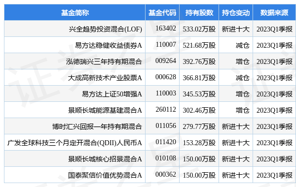 根据2023Q1季报公募基金重仓股数据,重仓该股的公募基金共165家,其中持有数量最多的公募基金为兴全趋势投资混合(LOF)。兴全趋势投资混合(LOF)目前规模为201.61亿元,最新净值0.6472(5月5日),较上一交易日下跌0.26%,近一年下跌3.9%。该公募基金现任基金经理为谢治宇 董理。谢治宇在任的基金产品包括:兴全合润混合(LOF),管理时间为2013年1月29日至今,期间收益率为497.05%;兴全合宜混合(LOF)A,管理时间为2018年1月23日至今,期间收益率为42.65%;兴全社会价值三年持有混合,管理时间为2019年12月26日至今,期间收益率为41.23%;董理在任的基金产品包括:兴全轻资产混合(LOF),管理时间为2017年11月23日至今,期间收益率为42.81%;