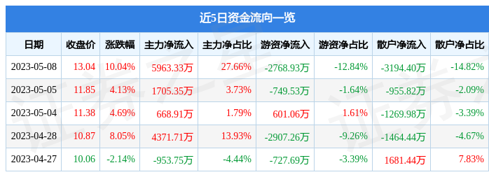 5月8日的资金流向数据方面,主力资金净流入5963.33万元,占总成交额27.66%,游资资金净流出2768.93万元,占总成交额12.84%,散户资金净流出3194.4万元,占总成交额14.82%。