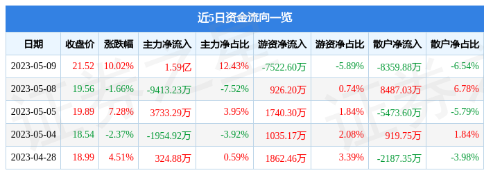 5月9日的资金流向数据方面,主力资金净流入1.59亿元,占总成交额12.43%,游资资金净流出7522.6万元,占总成交额5.89%,散户资金净流出8359.88万元,占总成交额6.54%。