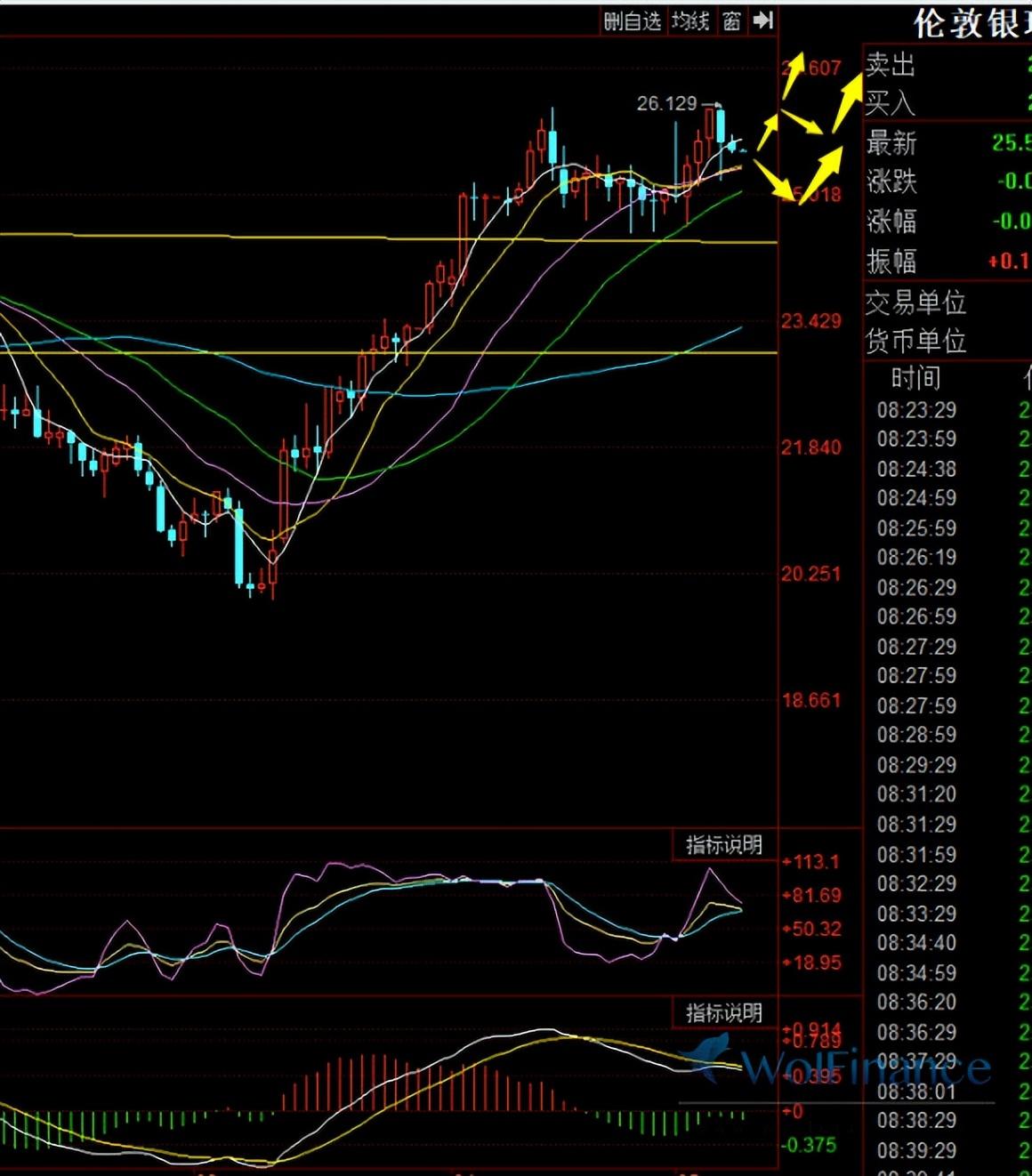 周一(5月8日)白银价格维持25.73-25.5区间震荡,日线收小阴线。