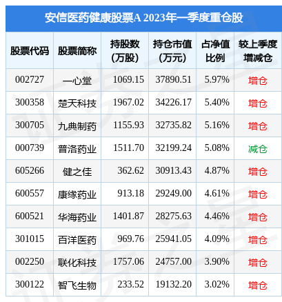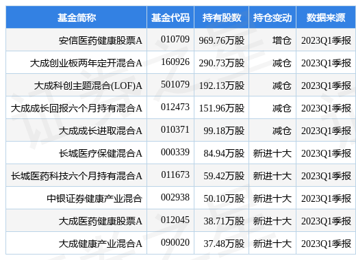 根据2023Q1季报公募基金重仓股数据,重仓该股的公募基金共14家,其中持有数量最多的公募基金为安信医药健康股票A。安信医药健康股票A目前规模为33.52亿元,最新净值1.2935(5月8日),较上一交易日下跌1.29%,近一年上涨18.4%。该公募基金现任基金经理为池陈森。