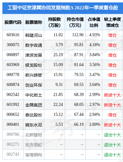 根据2022Q1季报基金重仓股数据,重仓该股的基金共2家,其中持有数量最多的基金为工银中证京津冀协同发展指数A。工银中证京津冀协同发展指数A目前规模为0.17亿元,最新净值1.0278(5月6日),较上一交易日下跌3.08%,近一年下跌6.1%。该基金现任基金经理为刘伟琳。刘伟琳在任的公募基金包括:工银沪深300指数A,管理时间为2014年10月17日至今,期间收益率为73.39%;工银中证传媒指数(LOF)A,管理时间为2015年5月21日至今,期间收益率为-79.91%;工银印度基金人民币,管理时间为2018年6月15日至今,期间收益率为16.86%。