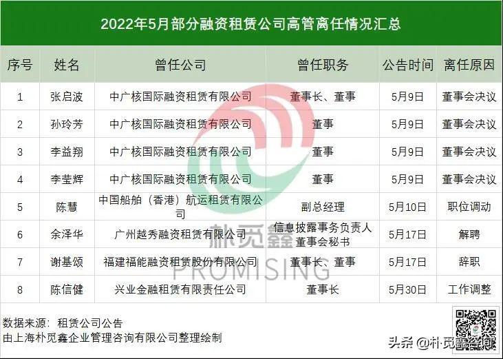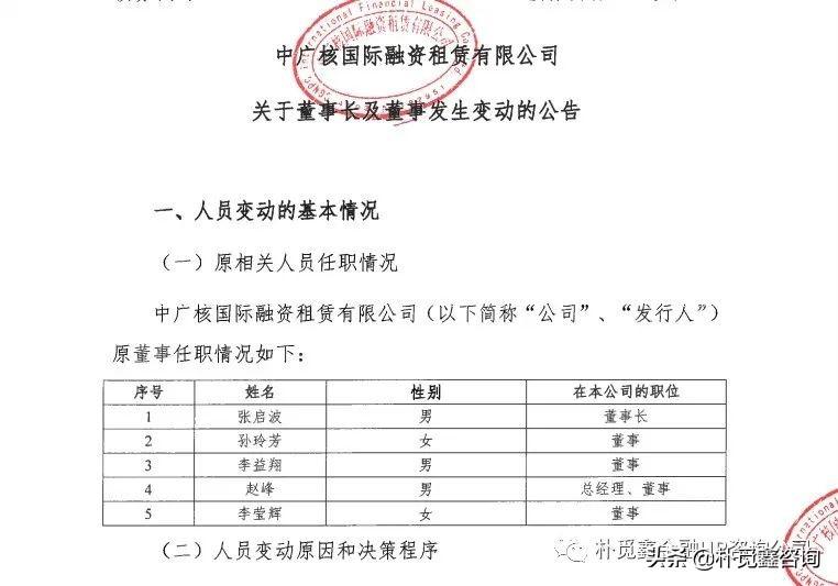 2022年5月9日,中广核国际融资租赁有限公司(简称中广核租赁)发布人事变动公告,在公告中,披露了原董事及现任董事。
