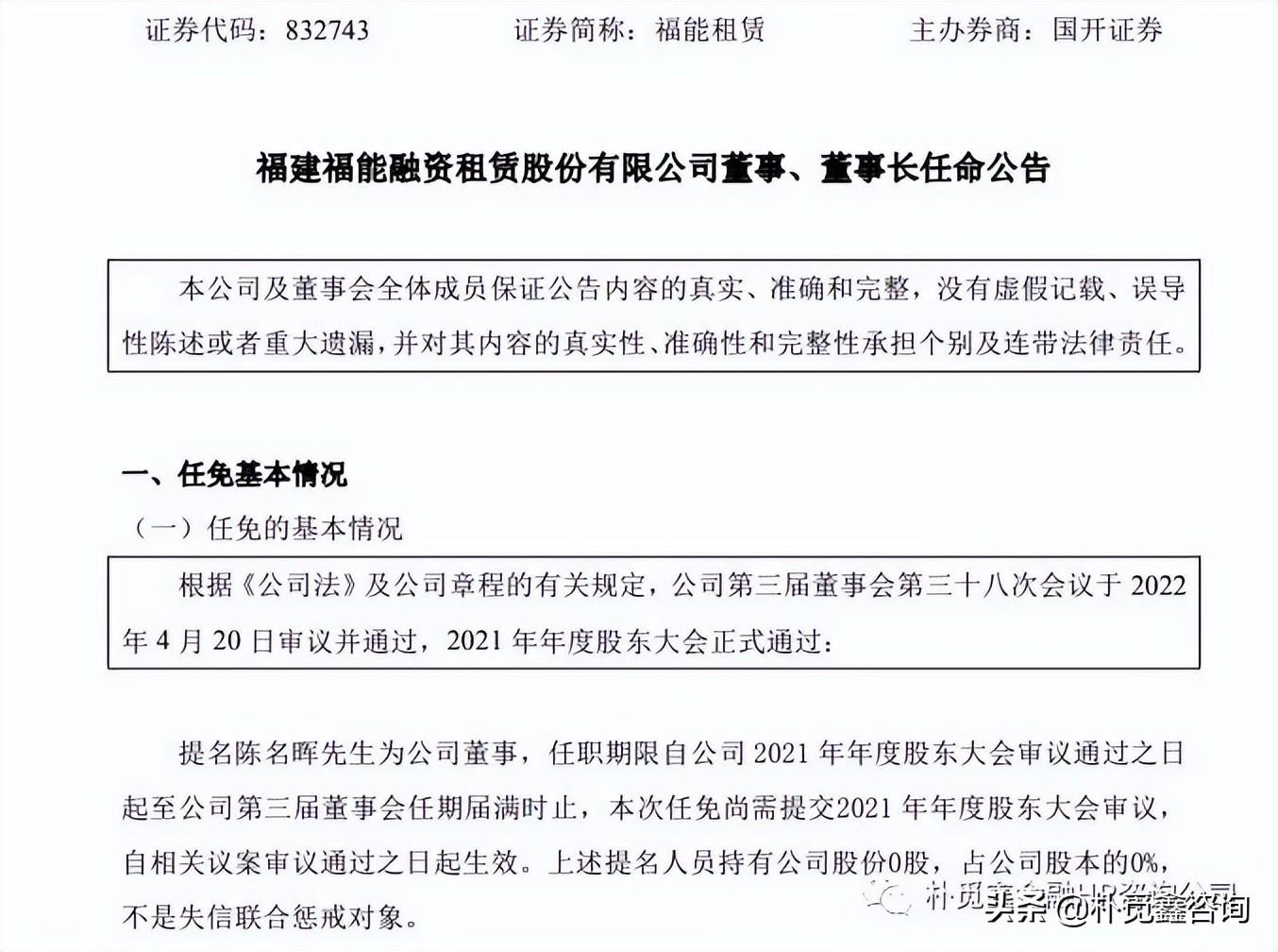 三、福能租赁董事长辞职,提名陈名晖为新任董事长