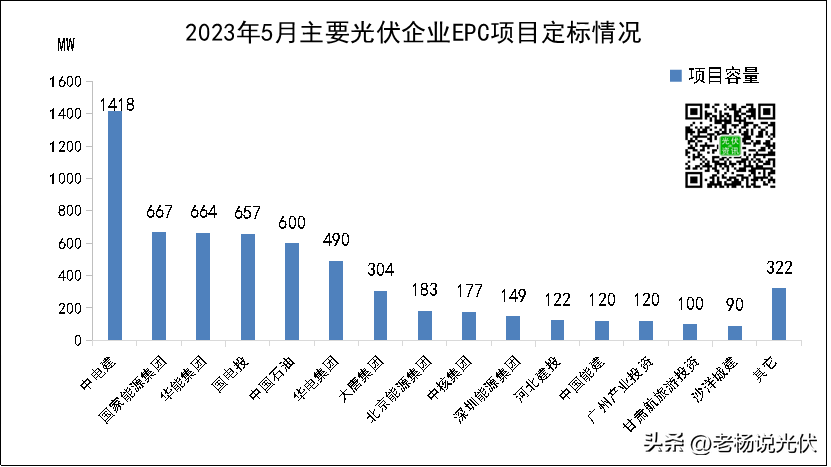 2023年5月,招标项目容量及招标项目数量前四的分别是中电建、国家能源集团、华能集团和国电投其项目容量分别为1418.05MW、667.65MW、664.13MW和657.45MW,四家合计占据5月EPC中标总项目的54.06%。