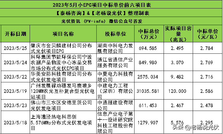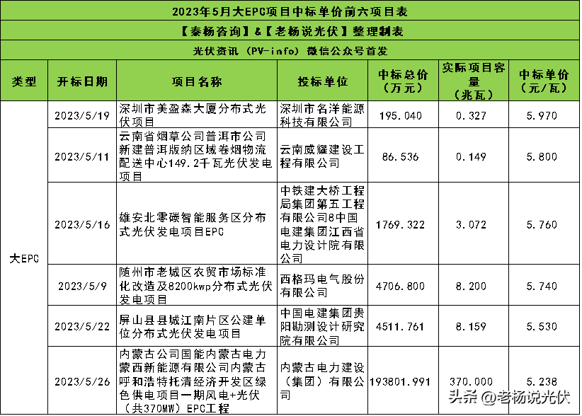 5月大EPC项目中,中标单价最高的是:深圳市美盈森大厦分布式光伏项目,中标企业为深圳市名洋能源科技有限公司,项目容量0.3267MW,中标单价为5.97元/W;