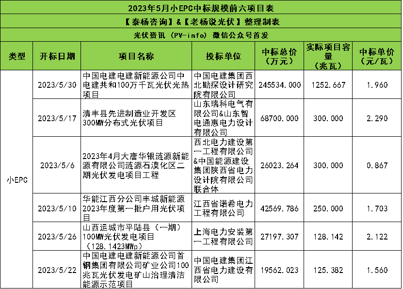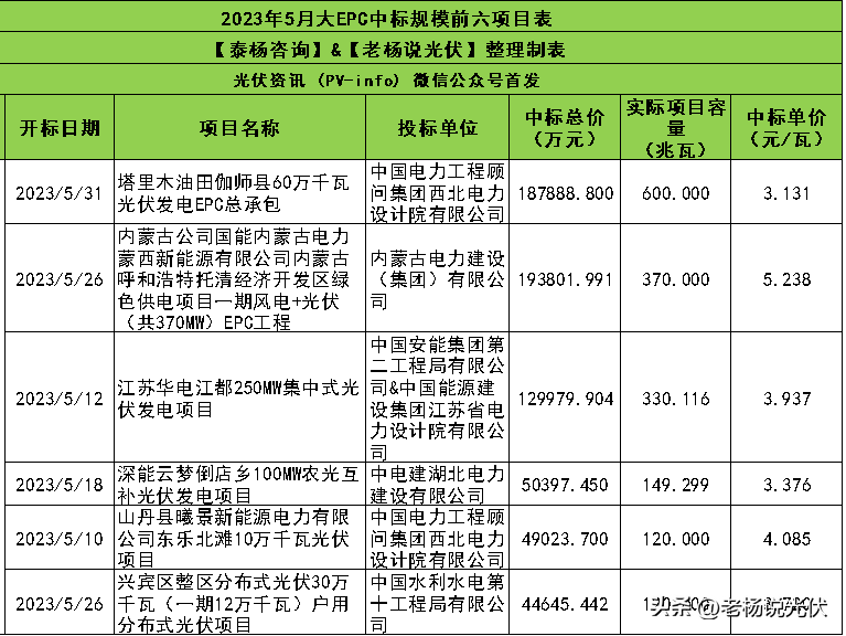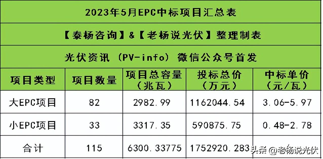 光伏资讯根据公开数据不完全统计,2023年5月,光伏EPC中标项目共计115个,中标总规模约为6.3GW,投标总价约为175.3亿元。5月EPC项目中标均价为3.41元/W。
