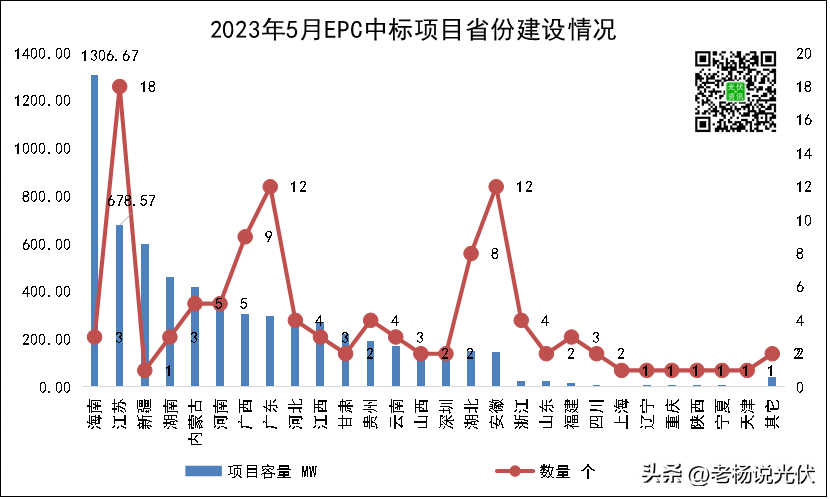 5月海南以中标项目容量1306.67MW排名第一,其次是江苏,其项目容量为678.57MW,新疆位居第三,其项目容量为600MW。