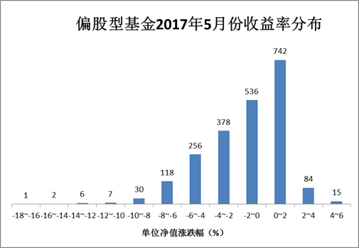 2017年5月份偏股型开放式基金的收益率分布显示,超过半数基金收益告负。据牛熊交易室统计,在剔除成立不足三个月及疑似大额赎回的基金后,有61.32%的基金产品获得负收益。其中,有914只基金密集的分布在-2~2%这个收益区间,占比达42%。
