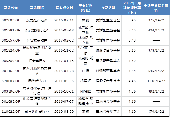 首先来看一下哪些偏股型基金5月份的收益率最佳。