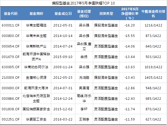 表2:偏股型基金2017年5月净值跌幅TOP 10;来源:Wind资讯,牛熊交易室