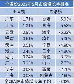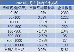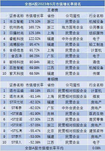 据大智慧财汇元数据,剔除2023年5月上市的新股,全部A股上市公司共5161家(其中包括北交所191家)。以市值增长率为主要排行指标,从不同地区、行业、市值规模等多个维度进行横向和纵向比较,排行榜如下: