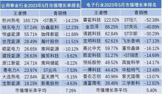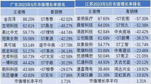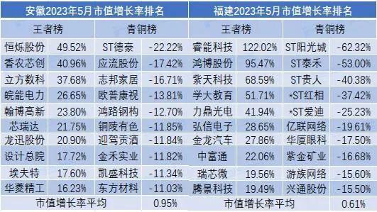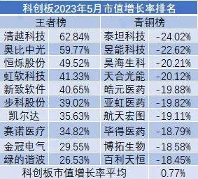 其中王者榜中排名前三的清越科技、奥比中光和恒烁股份,5月增长率分别为62.84%、59.77%和49.52%,王者榜中前五企业市值增长率均超40%。