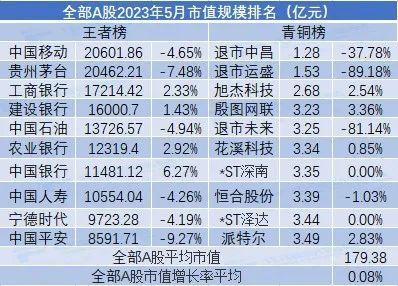 从5月A股整体来看,市值规模超万亿的公司共有8家,王者榜中中国移动本月市值成功超越茅台,登顶全市场排名第一的宝座。茅台市值下滑至第二位。榜中中国平安和贵州茅台市值下滑最为严重,分别为-9.27%和-7.48%,增长最多为中国银行的6.27%。