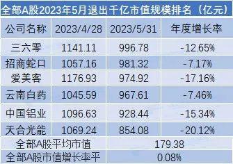 5月退出千亿市值企业共6家,较上月减少1家。其中天合光能月市值下滑最为明显,达20.12%,其次三六零、爱美客和中国铝业月市值下滑超10%。