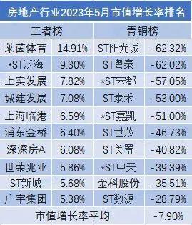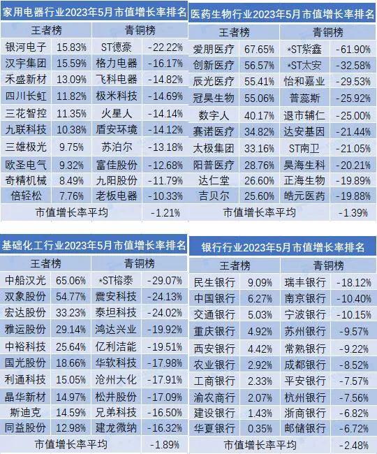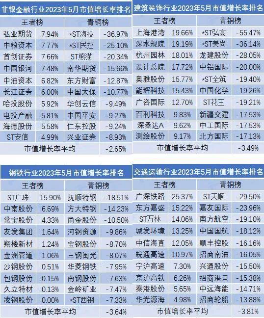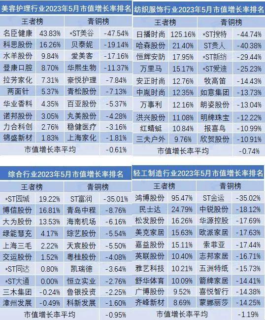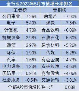 按申万行业分类,全市场共9个行业在2023年5月继续实现市值正增长,其余均不同程度下滑。