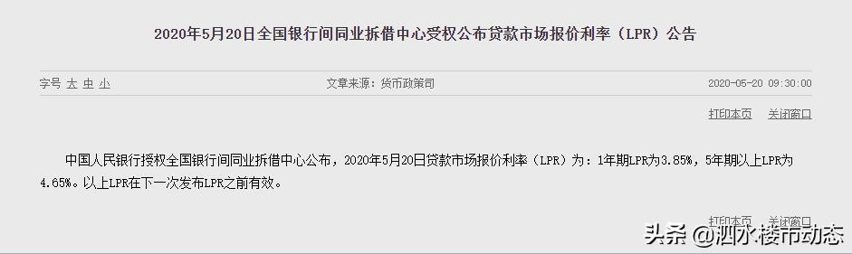 今天,央行发布了五月份最新贷款市场报价利率。2020年5月20日贷款市场报价利率(LPR)为:1年期LPR为3.85%,5年期以上LPR为4.65%,本轮报价利率与上月相持平。