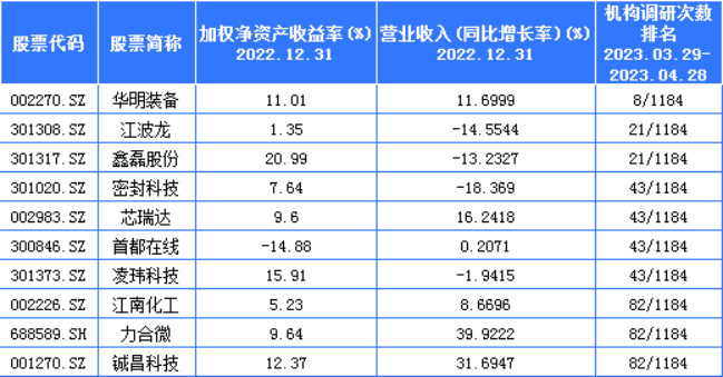 4月机构参与调研最多的“隐形冠军”排名有:华明装备、江波龙、鑫磊股份、密封科技、芯瑞达、首都在线、凌玮科技、江南化工、力合微、铖昌科技。