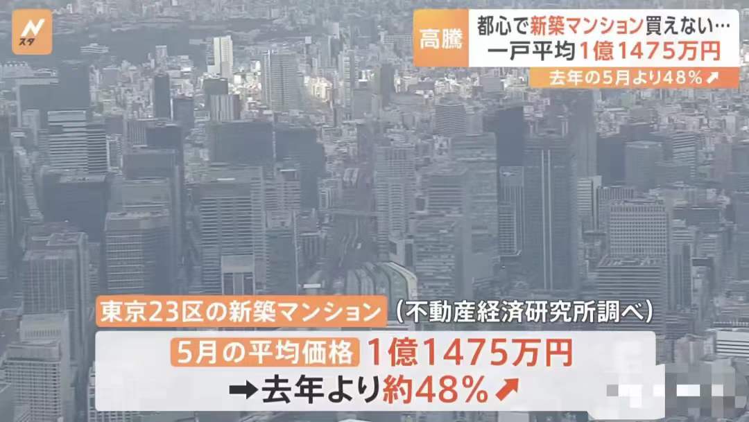据民间调查公司不动产经济研究所统计,5月东京23区新建公寓的平均价格为1亿1,475万日元,比去年5月上涨48%左右,连续3个月超过1亿日元。
