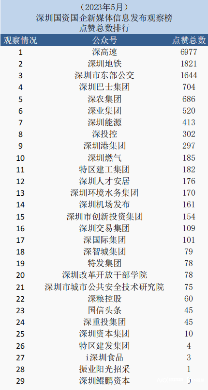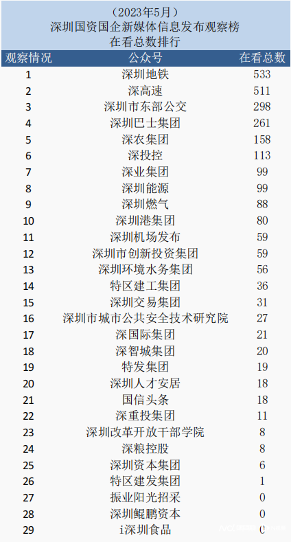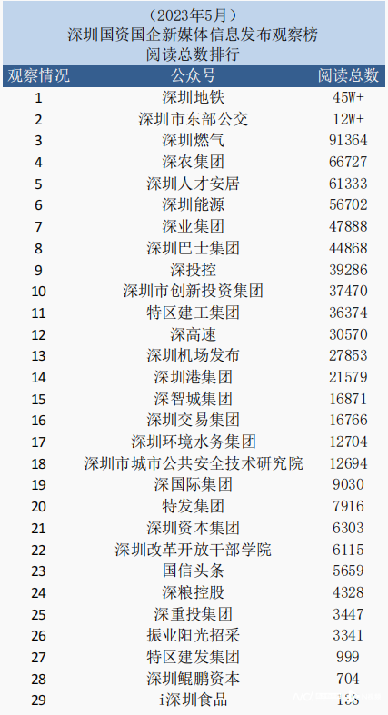 从2022年第一季度起,南都对深圳市属国有企业及深圳国资控股或参股的上市公司新媒体的信息发布情况进行测评,推出“深圳国企新媒体信息发布观察榜”,今天推出第十五期观察榜,对深圳国企新媒体优秀传播案例进行提炼和分析,总结运营和传播经验,致力于促进深圳国企新媒体的蓬勃发展。本月推出的是“2023年5月深圳国企新媒体信息发布观察榜”。所有测评公众号的数据收集截至5月31日。