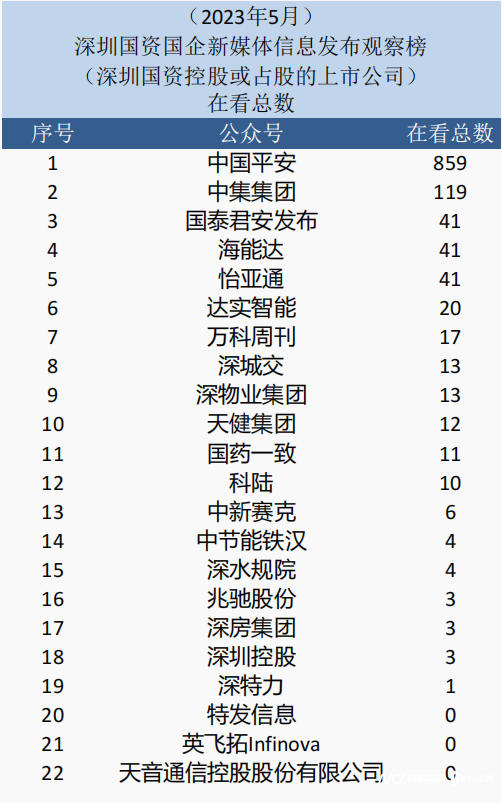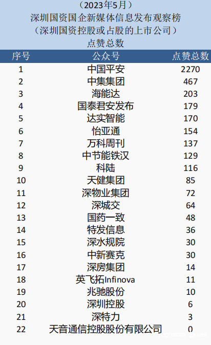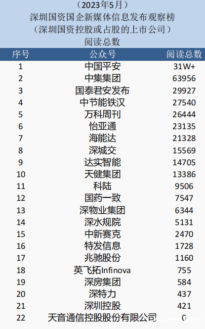 在29个国企一级账号中,深圳地铁的总阅读量为45W+,表现亮眼。i深圳食品则排名垫底,阅读量仅138。而在22个上市国企中,中国平安、中集集团、国泰君安发布阅读量排名前三。天音通信控股股份有限公司5月零更新,各项测评指标均为零。