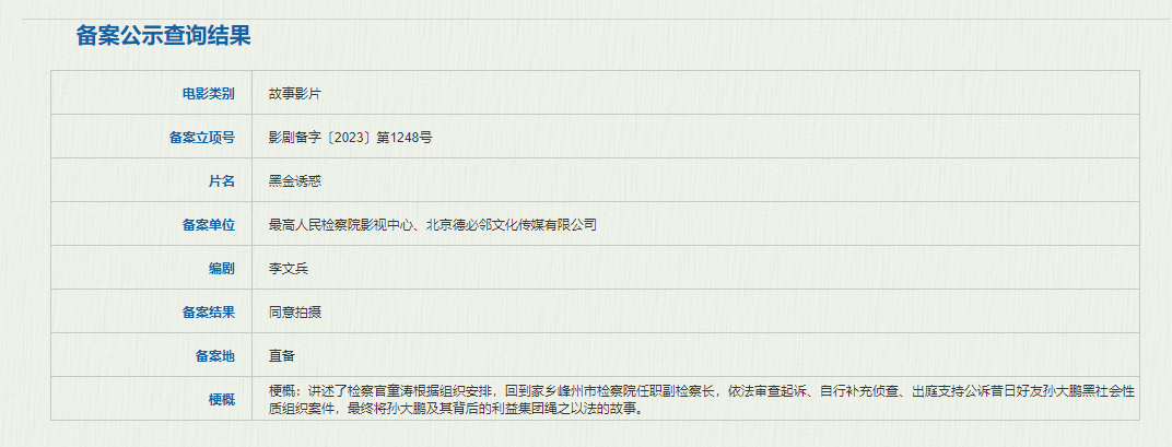 最高人民检察院影视中心、北京德必邻文化传媒有限公司备案的《黑金诱惑》讲述的是讲述了检察官童涛根据组织安排,回到家乡峰州市检察院任职副检察长,依法审查起诉、自行补充侦查、出庭支持公诉昔日好友孙大鹏黑社会性质组织案件,最终将孙大鹏及其背后的利益集团绳之以法的故事。