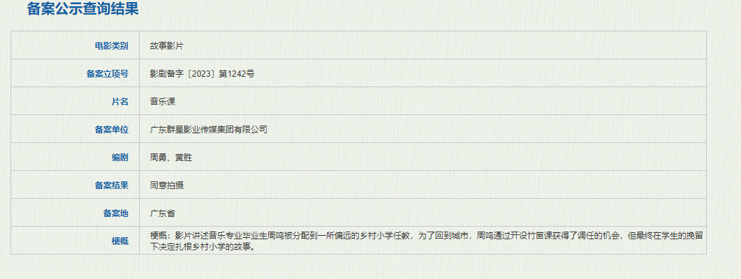 广东群星影业传媒集团有限公司备案的《音乐课》讲述的是音乐专业毕业生周鸣被分配到一所偏远的乡村小学任教,为了回到城市,周鸣通过开设竹笛课获得了调任的机会,但最终在学生的挽留下决定扎根乡村小学的故事。据悉,其剧本是第17届夏衍杯电影剧本征文的获奖作品,影片部分故事取材于第25届“江西青年五四奖章”与泰和县首届“五一劳动奖章”获得者、泰和县水槎乡中心小学音乐教师肖惠文。