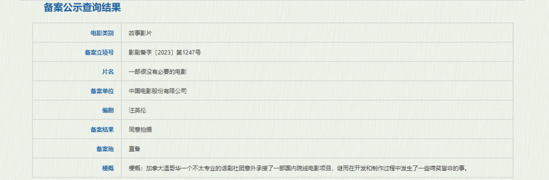 中国电影股份有限公司备案的《一部很没有必要的电影》讲述的是加拿大温哥华一个不太专业的话剧社团意外承接了一部国内院线电影项目,继而在开发和制作过程中发生了一些啼笑皆非的事。据悉,这部电影是2022年豆瓣评分最高华语电影之一《一场很没有必要的春晚》的衍生电影,《一部很没有必要的电影》将继续延续荒诞喜剧风格。