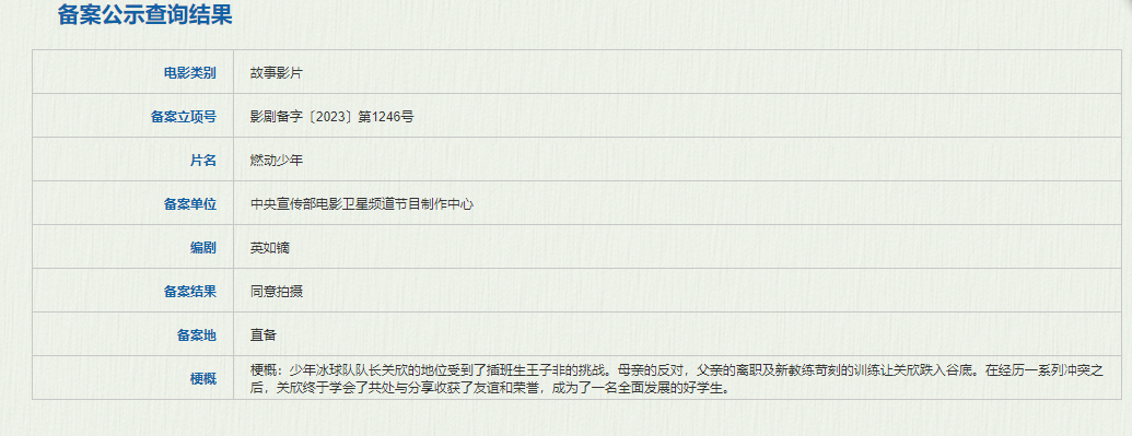 中央宣传部电影卫星频道节目制作中心备案的《燃动少年》讲述的是少年冰球队队长关欣的地位受到了插班生王子非的挑战。母亲的反对,父亲的离职及新教练苛刻的训练让关欣跌入谷底。在经历一系列冲突之后,关欣终于学会了共处与分享收获了友谊和荣誉,成为了一名全面发展的好学生。据悉,这是国家冰球队运动员英如镝退役后的电影处女作,值得期待。