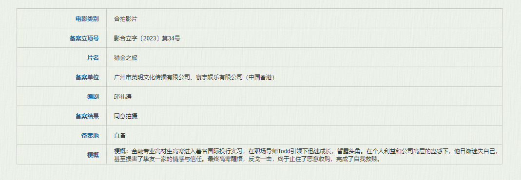 广州市英明文化传播有限公司、寰宇娱乐有限公司备案的《猎金之旅》讲述的是金融专业高材生高寒进入著名国际投行实习,在职场导师Todd引领下迅速成长,暂露头角。在个人利益和公司高层的蛊惑下,他日渐迷失自己,甚至损害了挚友一家的情感与信任。最终高寒醒悟,反戈一击,终于止住了恶意收购,完成了自我救赎。据悉,电影由邱礼涛担任编剧,是邱礼涛和寰宇娱乐继《黑白道》《高举·爱》《拆弹专家》《拆弹专家2》《扫毒2》《扫毒3》后的再次合作。