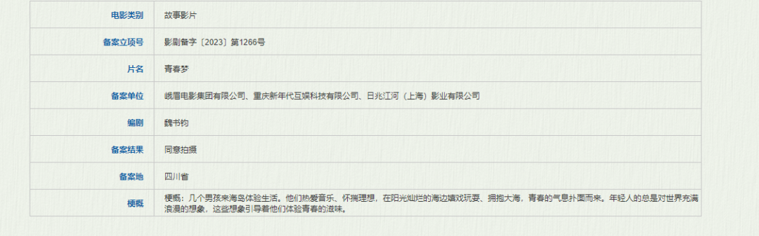 峨眉电影集团有限公司、重庆新年代互娱科技有限公司、日兆江河(上海)影业有限公司备案的《青春梦》讲述的是几个男孩来海岛体验生活。他们热爱音乐、怀揣理想,在阳光灿烂的海边嬉戏玩耍、拥抱大海,青春的气息扑面而来。年轻人的总是对世界充满浪漫的想象,这些想象引导着他们体验青春的滋味。据悉,本片将由《野马分鬃》《永安镇故事集》《河边的错误》的导演魏书钧编剧。