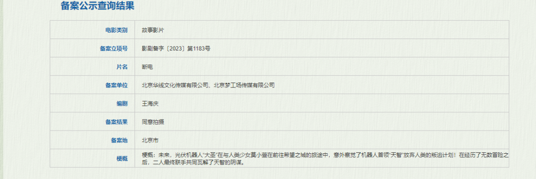 北京华线文化传媒有限公司、北京梦工场传媒有限公司备案的《断电》讲述的是,未来光伏机器人“大圣”在与人类少女莫小萱在前往希望之城的旅途中,意外察觉了机器人首领“天智”放弃人类的叛逃计划!在经历了无数冒险之后,二人最终联手共同瓦解了天智的阴谋。