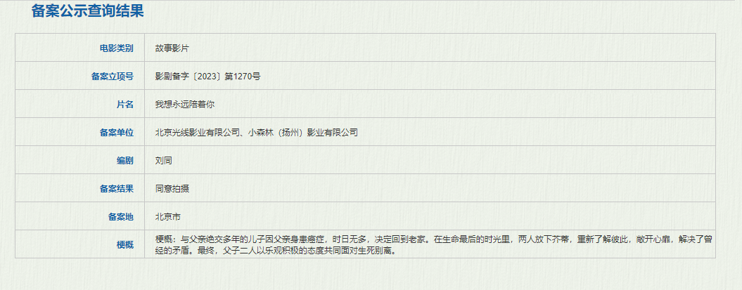 北京光线影业有限公司小森林(扬州)影业有限公司备案的《我想永远陪你》讲述的是与父亲绝交多年的儿子因父亲身患癌症,时日无多,决定回到老家。在生命最后的时光里,两人放下芥蒂,重新了解彼此,敞开心扉,解决了曾经的矛盾。最终,父子二人以乐观积极的态度共同面对生死别离。据悉,电影的编剧为刘同,毕业于湖南师范大学中文系,青年作家,光线影业副总裁,曾担任《大鱼海棠》《同桌的你》等多部华语电影制片人、《寻龙诀》联合监制。