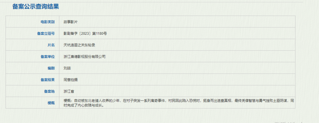 浙江唐德影视股份有限公司备案的《天坑追匪之关东秘录》讲述的是自幼被东北老猎人收养的少年,在村子突发一系列离奇事件,村民因此陷入恐慌时,挺身而出追查真相,最终凭借智慧与勇气挫败土匪阴谋,同时完成了内心救赎与成长。