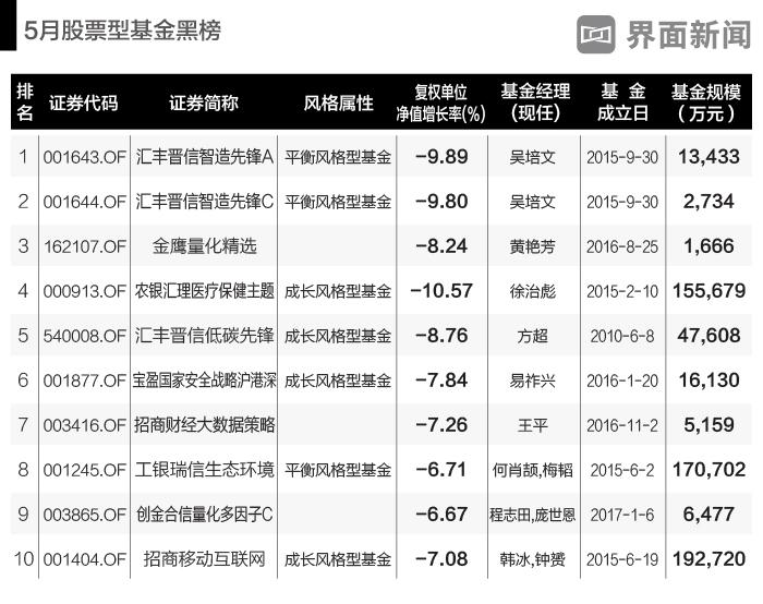 界面新闻从收益率、波动率、择时与选股四个维度综合评估,形成每月基金红黑榜,并对上榜基金进行长期跟踪,试图从中找到收益相对较高、风险相对较低,长期业绩优秀的基金,下面是对5月股票型基金的评估与跟踪。