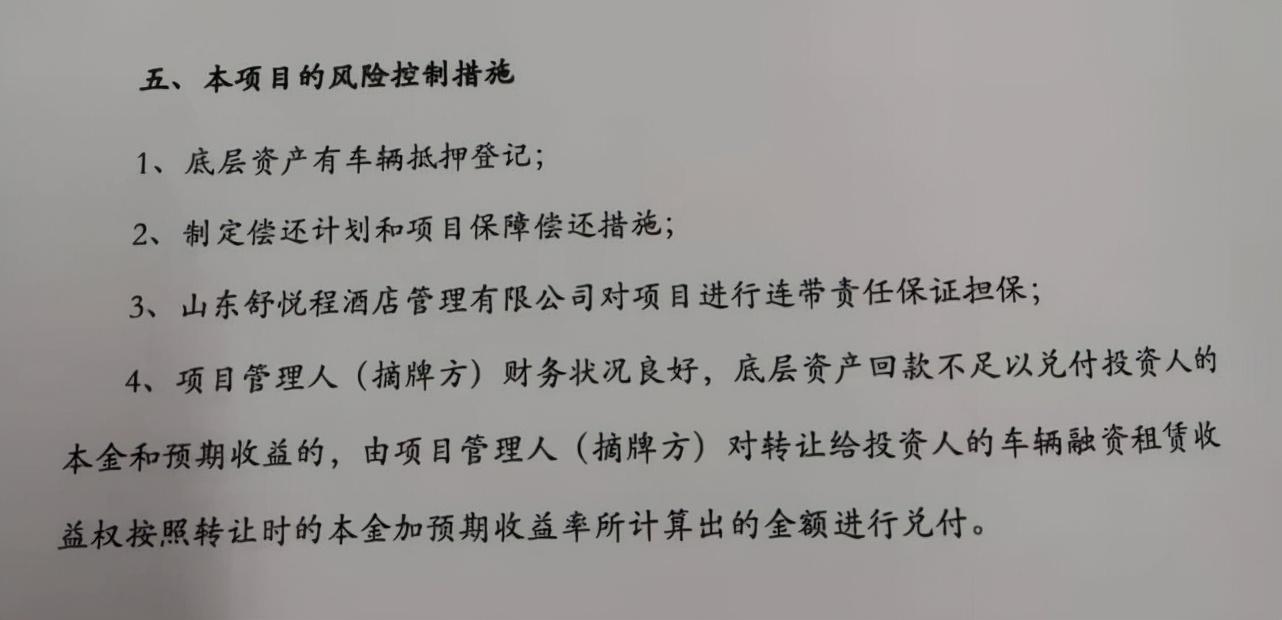 在李女士提供的《项目简介》中,北京亿金所对该项目多次进行了变相刚兑承诺,称“回款不足以兑付投资人的本金和预期收益的,由项目管理人对转让给投资人的车辆融资租赁收益权按照转让时的本金加预期收益率所计算出的金额进行兑付。”而且提到山东舒悦程酒店管理有限公司对项目进行连带责任保证担保。