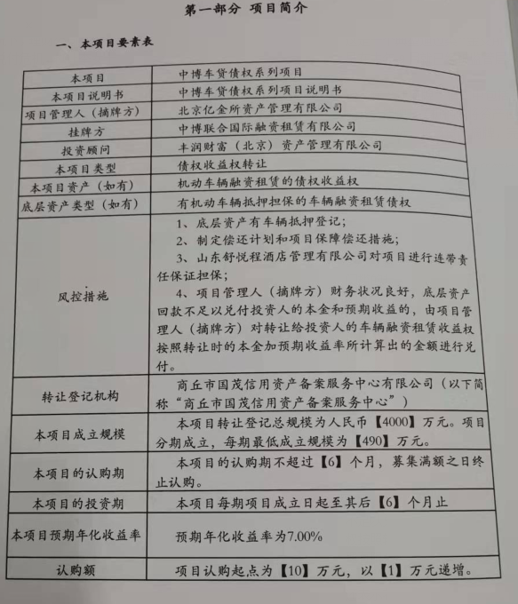 “中博车贷”属于中博车贷债权系列项目,对应的底层资产为机动车辆融资租赁的债权收益权,挂牌方为中博联合国际融资租赁有限公司,挂牌场所为商丘市国茂信用资产备案服务中心,总规模为4000万元,项目分期成立,每期最低成立规模为490万元。