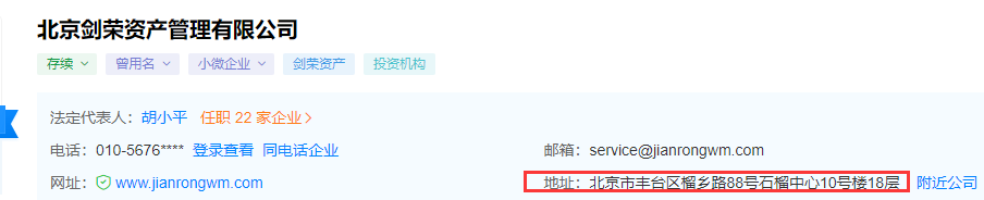 北京尚玺资产官网已经长期没有更新,官网留下的办公地址为北京市丰台区榴乡路88号石榴中心。而剑荣资产也在石榴中心办公。