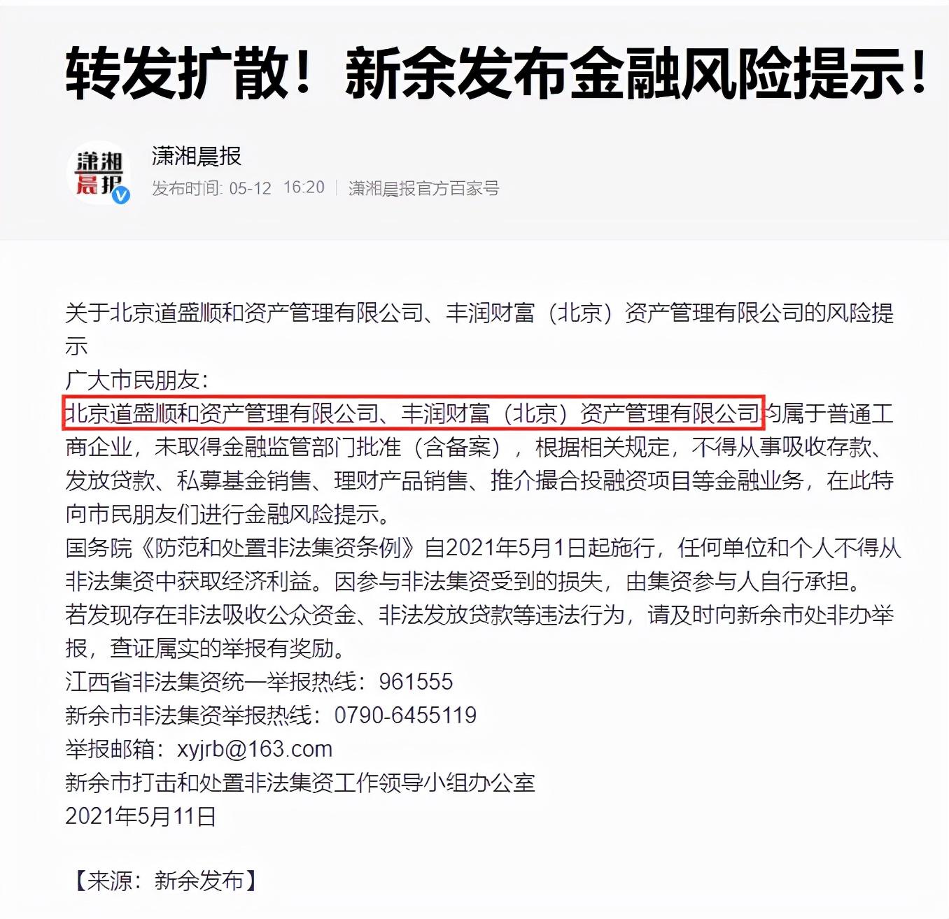 投资顾问丰润财富(北京)资产管理有限公司成立于2015年。今年5月11日,江西新余市打击和处置非法集资工作领导小组办公室曾经发布风险提示,称北京道盛顺和资产管理有限公司、丰润财富(北京)资产管理有限公司均属于普通工商企业,未取得金融监管部门批准(含备案),根据相关规定,不得从事吸收存款、发放贷款、私募基金销售、理财产品销售、推介撮合投融资项目等金融业务,特向市民进行金融风险提示。