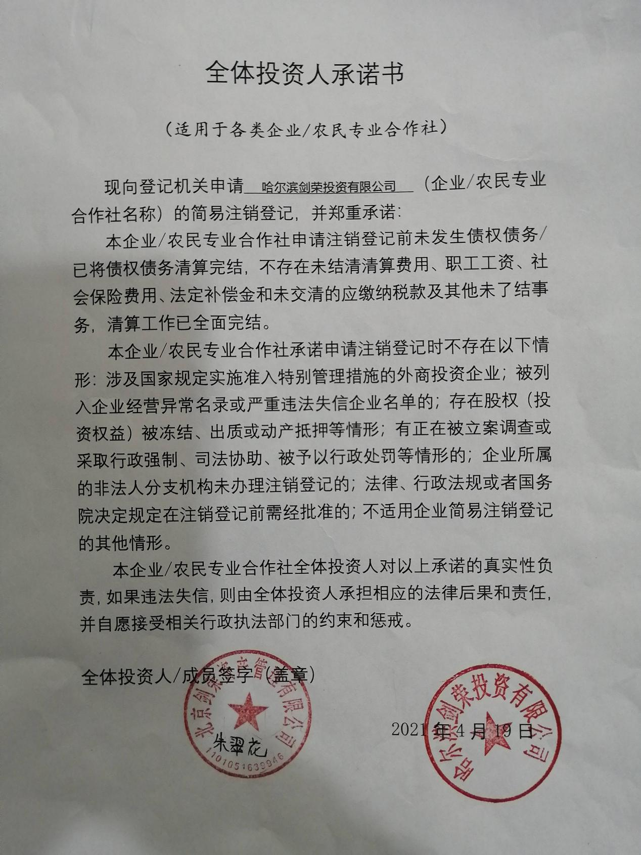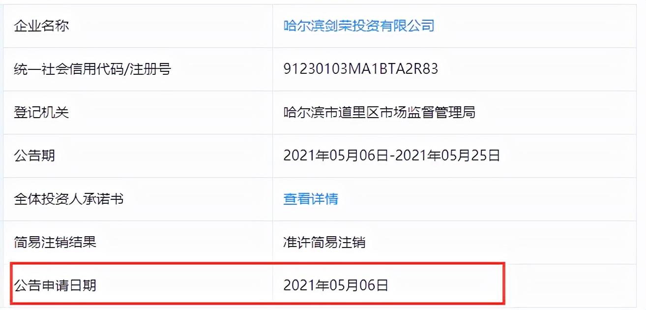 虽然北京亿金所“死而复生”,但更令李女士惊讶的是,当初自己和同事都是通过哈尔滨剑荣了解到这款产品,并转账给北京亿金所。而在今年4月19日,哈尔滨剑荣就向市场监管局提交了简易注销登记,注销公告期为5月6日-5月25日。