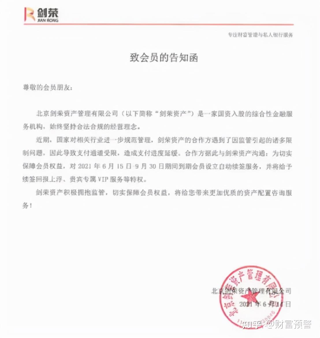 今年6月14日,网上传出一份剑荣资产《致会员的告知函》,称剑荣作为国资入股的综合性金融服务机构,始终坚持合法合规的经营理念。近期,由于剑荣资产的合作方遇到了因监管引起的诸多限制问题,因此导致支付通道受限,造成支付进度延缓。为保障会员权益,对6月15日-9月30日期间到期的会员设立自动续签服务,并将给予续签回报上浮、贵宾专属VIP服务等特权。