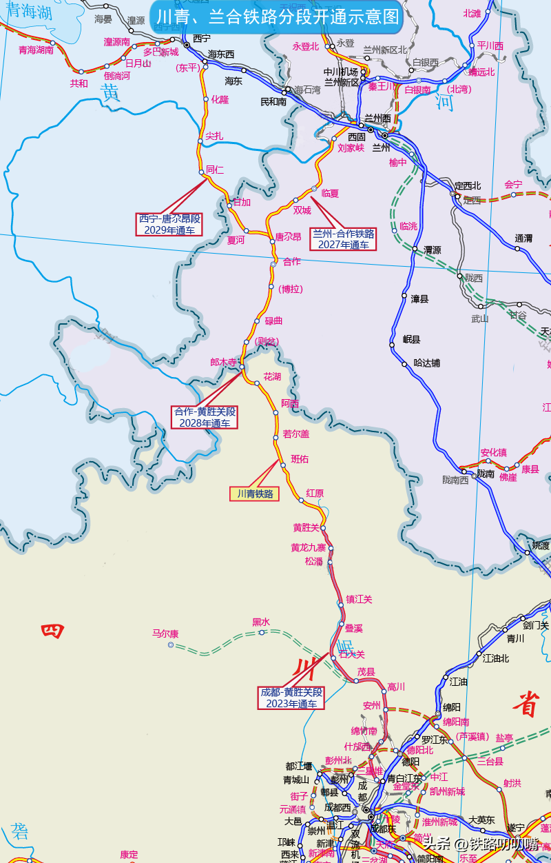 根据计划,川青段线路的建成时间也都不一样,其中唐尕昂至合作段计划与兰合铁路同步于2027年底建成;合作至郎木寺(黄胜关)段计划在2028年底开通;海东西至唐尕昂段工期将于2029年底建成,这也意味着川青铁路全线要在2029年底才能建成。