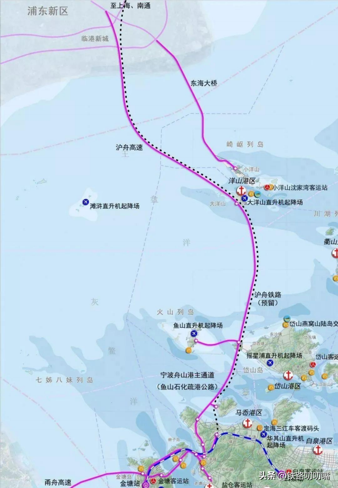 舟山至上海综合运输通道,全长约65公里,项目业主为沪舟通道前期工作办公室。根据前期研究方案,沪舟甬跨海通道为综合运输通道,采用公铁统筹研究,本次前期研究工作公路为洋山至岱山段,铁路为洋山至舟山本岛段。上海至大洋山段、大洋山至岱山段均推荐采用国铁I级双线、客货共线设计,设计速度200公里/小时。