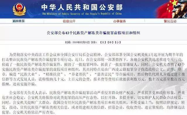 前,公安部公布了已查明的43个实施民族资产解冻类诈骗犯罪的虚假项目和组织,提醒大家注意甄别,避免上当受骗。