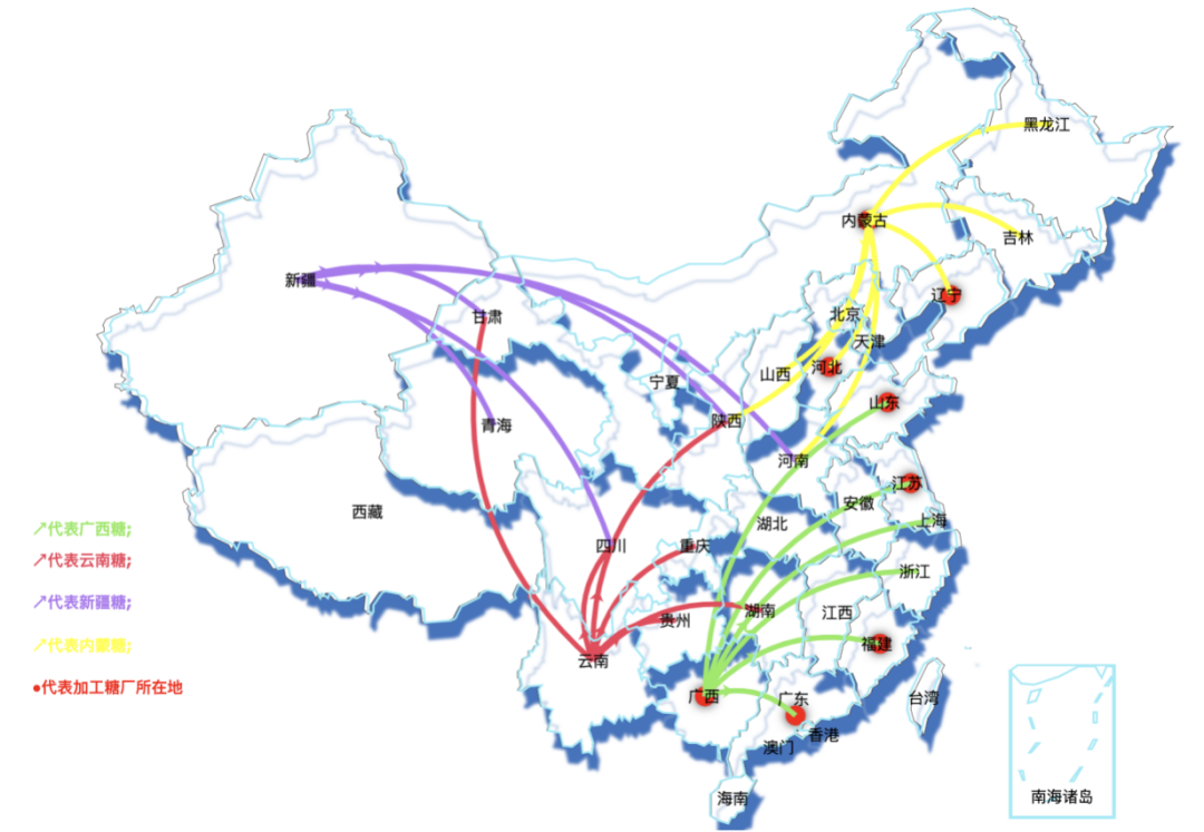 国产耕地糖分为北方甜菜糖与南方甘蔗糖,以各产区地域不同,甘蔗糖分为广西糖、云南糖、广东糖、海南糖等,甜菜糖分为新疆糖、内蒙糖等。各地区因自然资源禀赋不同,制糖周期与生产成本略有差异,由于所处区域位置不同,其辐射的销售市场范围也不尽相同。