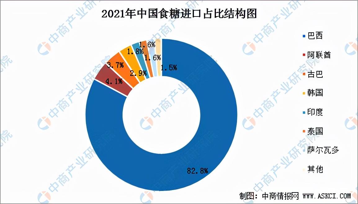 2021年1-12月,我国主要食糖进口来源国为巴西(468.83万吨,占比82.81%)、阿联酋(23.24万吨,占比4.11%)、古巴(21万吨,占比3.71%)、韩国(16.2万吨,占比2.86%)、印度(10.70万吨,占比1.83%)、泰国(10.33万吨,占比1.59%)萨尔瓦多(9万吨,占比1.59%)。